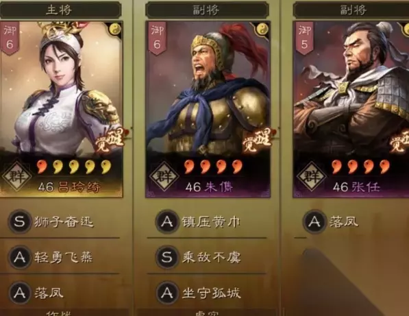 二、战法解析 1.吕玲绮 狮子奋迅+轻勇飞燕+落凤 为了与张任自带落凤形成双落凤的强力控制,同时也依赖落凤的高额伤害打出爆发,一般不建议替换落凤。如确实需要替换,建议换成纵兵劫掠、不辱使命。 轻勇飞燕可以替换成其他瞬发物理伤害战法,如横扫千军、短兵相见、敛众而击等。