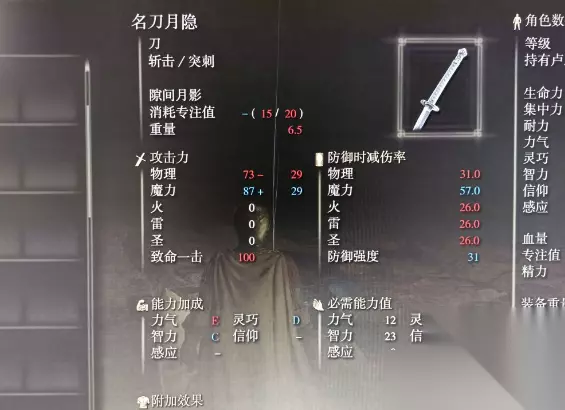 成功获得名刀月隐后,玩家可以查看其具体属性。这把太刀要求一定的力气、灵巧和智力值才能装备,其战技隙间月影能够释放出快速的远程剑气,兼顾了实用性与华丽的效果。它适合注重智力发展的构建,在提供可靠近战伤害的同时,其战技也能有效应对中距离的敌人,是一把性能全面的武器。