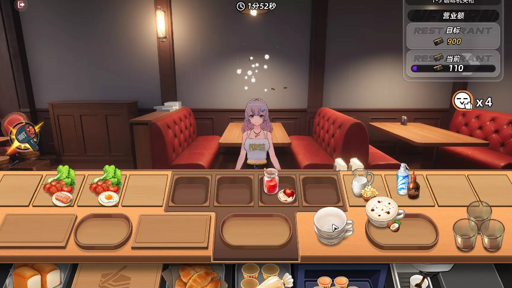 这关和1-10是第一阶段最难的两关,对咖啡操作频率要求很高,且几乎不能失误。 一大难点在于咖啡不一定会给耐心最低的客人,反而给到最新来的。 至少需要自动续杯技能…