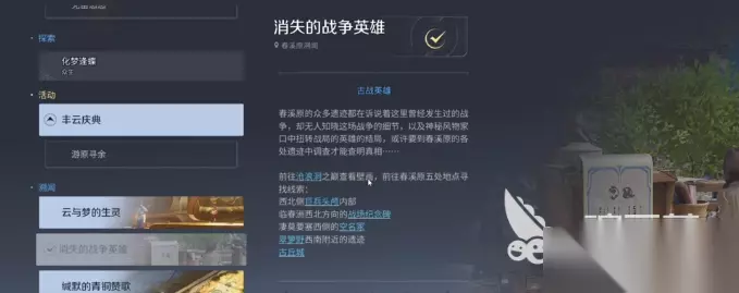 在王者荣耀世界中有很多支线任务可以完成,消失的战争英雄就是其中之一,完成这个任务后可以获得丰富的奖励,今天小编就为大家带来消失的战争英雄任务攻略,帮助各位拿到所有奖励。 王者荣耀世界消失的战争英雄任务攻略 1、首先来到溯洄营地和NPC白露对话接取任务,接到任务后会获得一个关键道具,然后需要玩家前往五个不同的地方收集物品。 2、第一个在巨兵头颅内部,传送到篱遁丘附近,然后从巨人的眼睛处进入,进入后启动机关,让光线照到其他两面镜子就可以解开谜题,解开谜题后就可以在祭坛处得到神纹头盔。 3、之后来到千帆角战场纪念碑处,然后操控石碑机关,内圈转三圈,外圈转两圈,等方碑亮起就可以激活祭坛,前往祭坛就可以拿到神纹腿甲。 4、第三个道具在春熙古战场空名冢探秘点,在这个探秘点找到两个黄色机关,各推一次就可以完成解密,完成解密后前往祭坛就可以获得神纹臂甲。 5、第四个在翠萝野附近的遗迹,传送过来后清完遗迹里的小怪就可以直接获得神纹胸甲。 6、第五个在古丘城,传送过来后会触发元歌傀儡鲲游任务,跟着任务进度走就可以完成,期间会有3次场地演出,完成任务后可以获得一个元歌唤灵,完成任务后不要走,在房间里可以看到一个祭坛,和祭坛互动就可以获得青铜密纹剑。 6、集齐五个道具后来到沧浪洞,将五个道具分别放在对应的底座上,放完后会获得拓印地图,拿到地图后会解锁后续任务,需要我们收集两个符印。 7、第一个符印在鹤鸣馆伏流窟,用道具击打大门两边的黄色机关就可以开启大门,开启大门后进入遗迹就可以找到第一个符印。 8、第二个符印在穿云峡间隐流谭,进入水下洞穴后就可以直接拿到第二个符印。 9、集齐两个符印后来到穿云峡间西边高台处提交符印,然后触发雕像转动,之后去下方的高台将附近的碎石击碎,然后回到高台操作机关,左边机关转2下,右边机关转3下,然后回到雕像中间互动,拿到道具后跟随指引前往水下,开启宝箱后继续向前,点击传送按钮后会被传送到另外一个位置。 10、之后在悬崖边拿到最后一个道具就可以完成任务。
