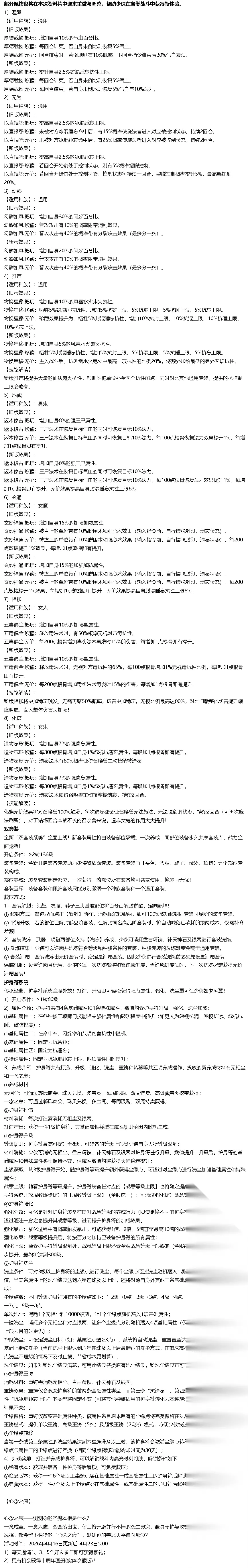 魔尊赠礼 活动时间:4月16日更新后~4月23日4:59 1.每日登陆即可免费领取礼包一份,更有多款超值好礼每日可购,机会不容错过。 2.购买量累积到一定数量时,可再获得一次特殊奖励,还可获得全新聊天气泡大殿风云! 风息秘藏 活动时间:2026年4月16日维护后-4月30日5:00 活动简介:资料片专属养成活动开启!大量折扣好礼供少侠限时抢购! 1)活动期间,可在风息秘藏中购买与护身符、双套装养成相关的限量折扣道具; 2)除超值折扣的“必买”商品外,在风息秘藏活动中以仙玉购买商品时可获得一定量限时货币风息,可在活动内兑换暮云合璧·圣魔、一念之息等奖励 洗尘有礼 活动时间:2026年4月16日维护后-4月30日5:00 护身符系统洗尘有礼,参与护身符养成,即有好礼相赠! 活动期内参与护身符养成,达成任务目标,即有无相尘、一念之息、永久称谓等多种好礼相赠。 更多好礼 在特卖后后续活动中,更多好礼即将上线! 全新珍稀神兽召唤兽幻肤白泽·森罗万象: