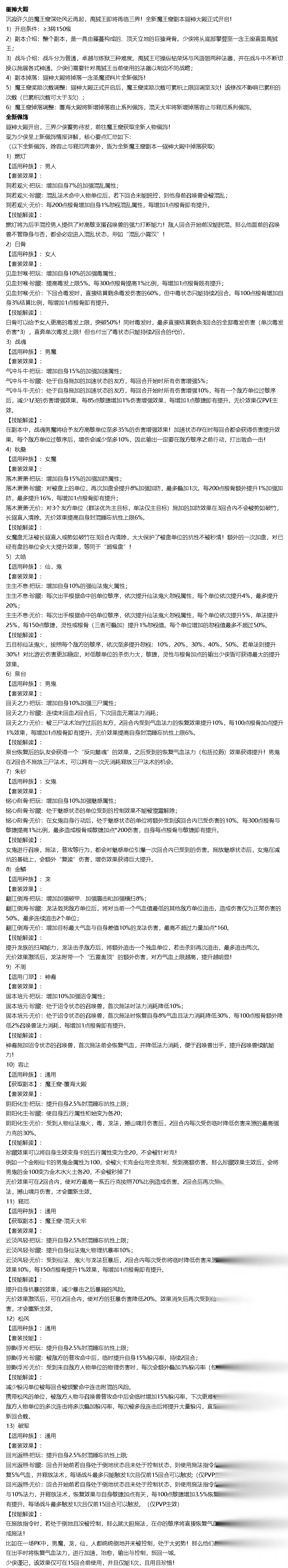 (获取途径:七圣对对碰) 【新手路引系统】 1)引导减负——4月16日维护后开启的新服,成长手册新增《路引》功能,会将新手期间接触的部分引导收纳起来,供少侠空闲后再去解锁和学习,同时精简了部分引导; 2)引导跳过——若检测到少侠为资深大话少侠或以前学习过此类引导,部分引导解锁时将直接跳过并发奖(如召唤兽配饰、天策符等引导); 3)剧情跳过——若检测到少侠为资深大话少侠或以前看过此类剧情,部分章节剧情将直接跳过并发奖; 【优化更新内容】 1. 优化了同城频道分享商品时的购买条件提示; 2. 优化了交易服每周特惠礼包的售价,使其更接近真实市场价格; 3. 优化了新服坐骑系统开启时的洗练有礼活动奖励; 4. 优化了多宝阁内奇珍宝袋的限购规则; 5. 女人孩子技能【惑心迷香】重做为“深度毒”: 原效果: 类型:合击技 条件:第1回合开始可使用,冷却4回合。 技能效果:本回合毒法伤害根据目标速度在一定范围波动。 强化效果:发动后毒法伤害无视速度高于自身目标当前丹心效果的一定百分比。 新效果: 类型:合击技 条件:第4回合开始可使用,冷却8回合。 技能效果:本回合施放毒法术后,每个被命中的单位有一定概率进入深度毒,其叠加两层毒状态,解除效果每次只能解除其中一层。 强化效果:发动该技能时临时提升忽视抗毒。 6. 召唤兽比斗排行榜优化: 1)排行榜单将改为根据各位少侠的等级区间划分为多个子榜进行展示; 2)每个子榜的筛选标签中,增加本服队伍和全服队伍,用于查看团队比斗排名; 7. 第四届召唤兽比斗争霸赛现已落下帷幕,各组别冠军雕像将在灵兽村矗立3个月,以志纪念,所有组别八强奖励正在紧张核算发放中; 8. 召唤兽比斗匹配规则优化,减少非压级服新手少侠频繁匹配到压级服少侠的情况; 9. 新版日程表优化:节日活动、活动推荐位置信息显示优化,增加活跃度进度显示~ 10. 高级藏宝图新增奖励:无相尘*20,并降低获得部分低价值奖励的几率(神兽丹、高技能书残卷等); 11. 应少侠们诉求,将适度放缓后续开服节奏; 12. 【单人召唤兽比斗】玩法将纳入【竞技系统】分档,将根据排行情况给予对应分档积分;