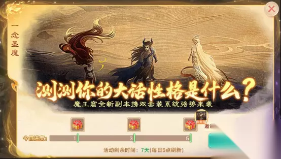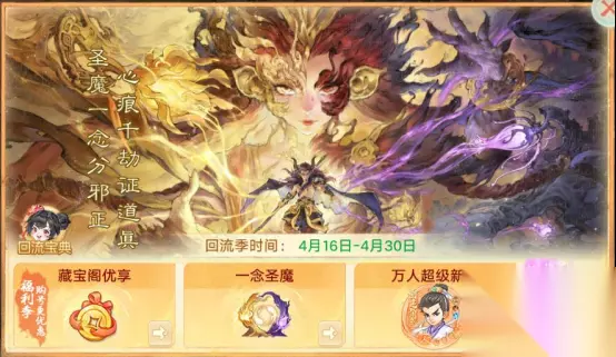 在本次回流季期间回归的少侠们可享受24小时在线特权,每日领取减负大礼包,必定获得唤星符和各类减负道具,还有活跃大礼包。每日达成活跃度要求后,可根据角色状况领取以下特权: “奇珍宝袋购买”:可在多宝阁中额外购买一次“奇珍宝袋”,每日生效一次; “外观体验特权”:可获得小五叶头饰(7日)和一套7日自选时装(在大圣、京剧、飞天降魔时装中自选其一),回流季期间仅生效一次; “每日行囊先抽后付”:获得1次每日行囊先抽后付的机会; 3)回流充返,送额外仙玉:回流少侠在福利季期间充值,额外赠送仙玉! 4)归阙夺珍,送高价值道具:回流少侠可使用归珍秘券参与抽奖,并可额外消耗对奖池进行加倍,抽取筋骨提气丸、高级凤羽精粹、高级藏宝图等惊喜大奖! 5)小霸王回流季福利加持: 回流季期间,长安小霸王处将开放“小五叶碎片”、“蠃鱼精魄”和“猴小孙残片”的限时兑换; 回流季期间,每日同回流少侠共同任务将会获得更多专属奖励; 回流季期间,可以使用“老友奖章”在长安小霸王处免费为小五叶或者蠃鱼学习技能; 6)藏宝阁购号特权:活动期间,藏宝阁也将开放领取满减券、购号抽奖等多个活动; 具体内容请登录游戏或藏宝阁主页查看; 【圣魔特卖会】 活动时间:2026年4月16日维护后-4月30日5:00 圣魔特卖会开启,资料片同名外观震撼上线! 充值有礼 活动时间:2026年4月16日5:00-4月30日5:00 活动简介:充值有礼,福利继续!活动期间,达成充值目标即可获得祈愿次数,祈愿可获得资料片头像框驱神征召、背景卡驱神大殿! 说明:抢先体验服务器中参与《一念圣魔》活动的少侠的相关充值将会计入本次充值有礼进度