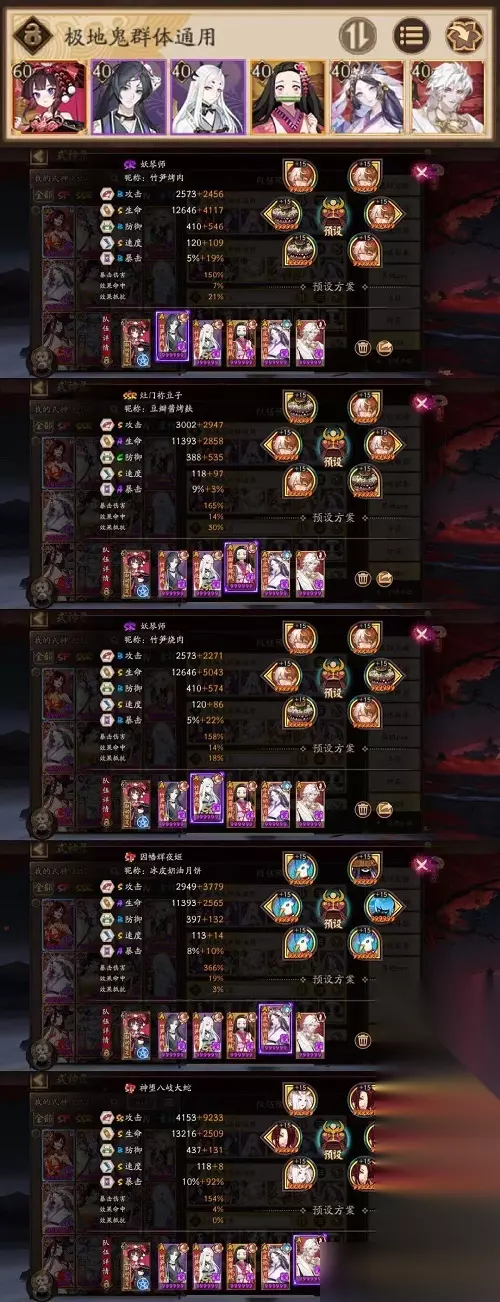 《阴阳师》地域鬼王分为普通和级两种模式,很多萌新玩家不知道这个副本应该怎么打,游戏宝233乐园小编带来《阴阳师》地域鬼王全阵容推荐,希望可以帮到大家。 《阴阳师》地域鬼王全阵容推荐 1、式神:琴 豆 琴 因 蛇。 2、御魂: ①妖琴1&妖琴2 招财地震鲶 速防攻。 ②弥豆子 招财地震鲶 速防攻。 ③Sp辉 火灵 攻攻爆伤 极限爆伤。 ④Sp蛇 针女歌姬 攻攻攻 满暴。 ⑤神乐 疾风 伞。 3、配速:妖琴1>弥豆子>妖琴2>200>神乐>sp辉>sp蛇。 4、操作:妖琴、豆子、sp辉锁二技能,神乐锁疾风,sp蛇自动,全程绿标sp蛇即可。 5、注意:不适用地藏鬼王及个别特殊鬼王(如三味书屋书翁,BOSS小怪有狰花鸟)。