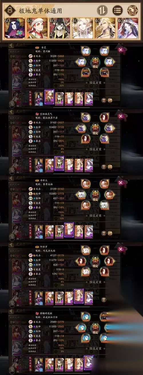 二、单体鬼王通用阵容(新出的鬼王) 1、式神:食 面 帝 修 因。 2、御魂: ①食灵 共潜 速攻攻。 ②Sp面 海月 速攻爆伤。 ③帝释天 招财 攻攻攻。 ④阿修罗 针女歌姬 攻攻攻 满暴。 ⑤Sp辉 火灵 攻攻爆伤 极限爆伤。 ⑥晴明 星 盾。 3、配速:食灵>sp面>195>帝释天>晴明>阿修罗>sp辉。 4、操作:食灵第一波喂饭给阿修罗,后续喂饭给sp面;sp面锁三技能;帝释天放二技能金莲,之后均普攻;阿修罗锁三技能;sp辉夜锁二技能;晴明锁星。 5、注意:如遇到地藏鬼王,建议用茶几替换阿修罗,茶几可切换“单体-不动”对地藏boss进行输出(不动不会触发boss御魂)。