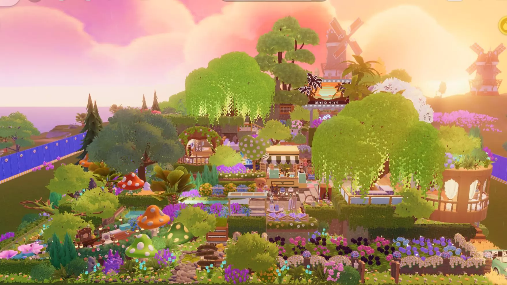 这是《重返未来1999》的家园荒原布局展示,实现了水域连通,将九种风格的场景整合在一起,荒原植物不受气候限制,能呈现不同季节花朵同开的奇异景观,满足多样的视觉需求。