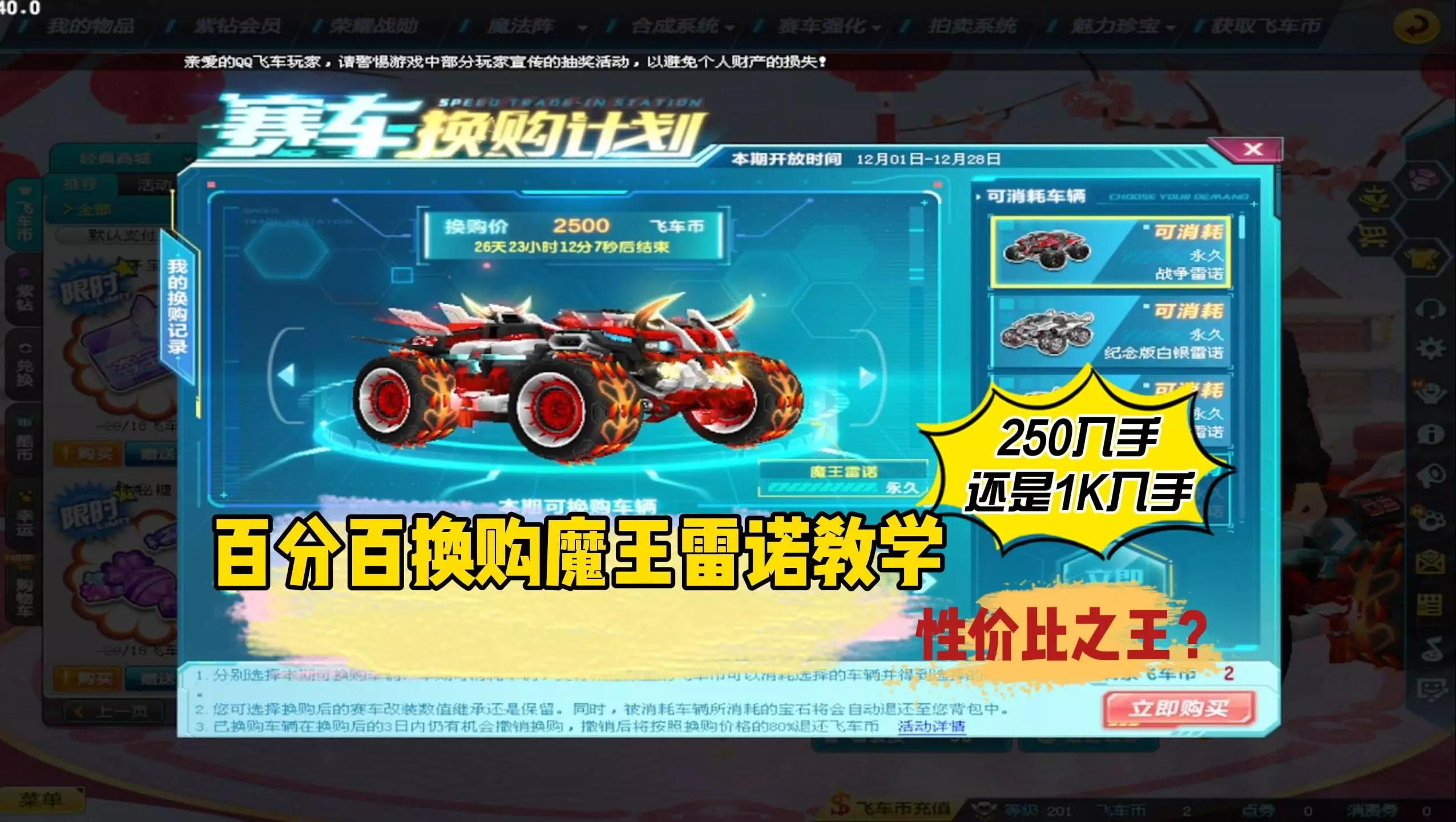 这是QQ飞车2026年5月赛车换购攻略,本次换购活动到5月17日下架,可用指定S车等消耗赛车,花费5000飞车币兑换极品S车地狱火、战争之神,换购后还能给赛车换皮肤,部分赛车收藏价值高。