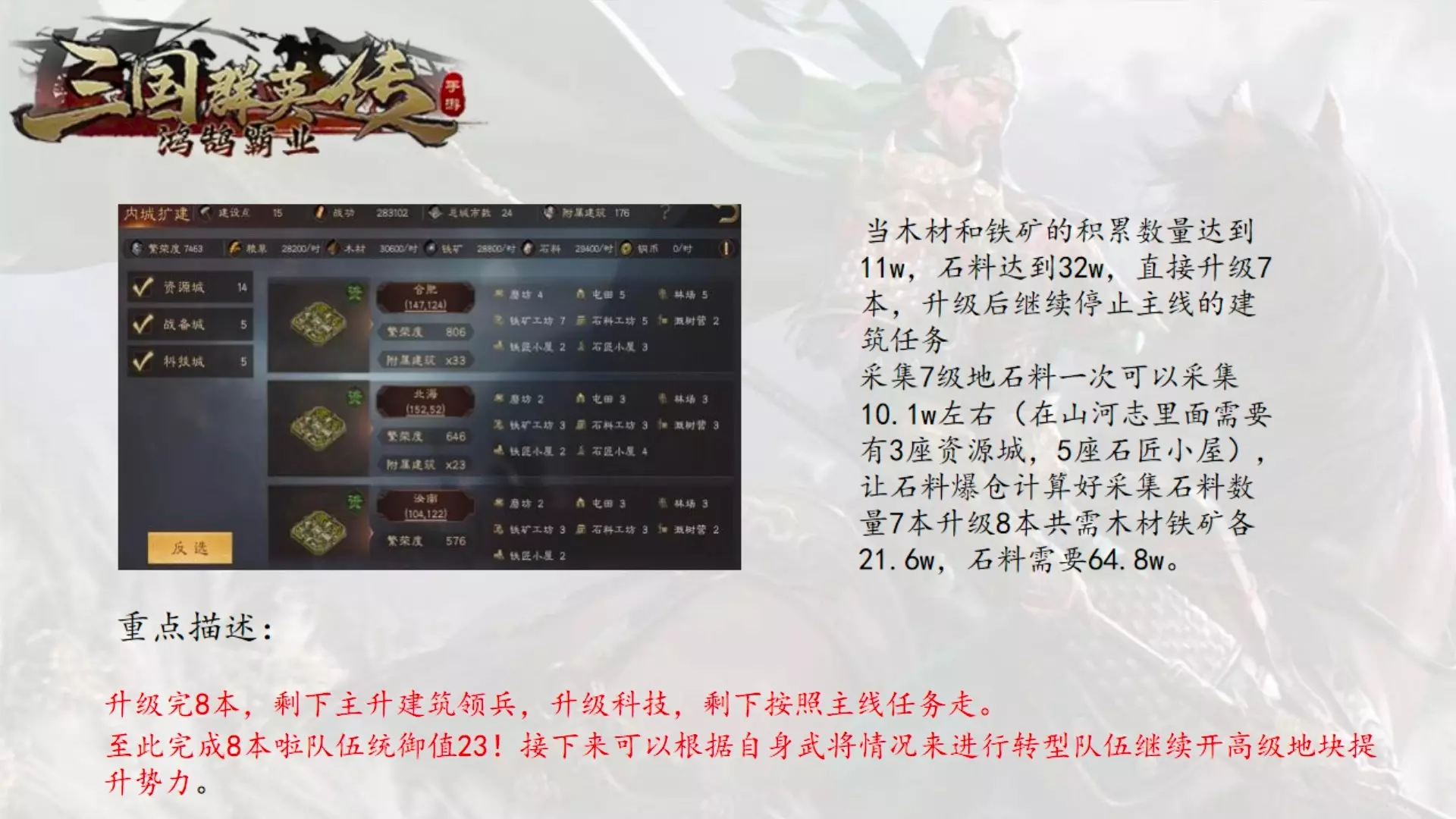 这是SLG游戏《三国群英传:鸿鹄霸业》的S2赛季开荒攻略,提醒玩家注意开荒前落地情况,还提及可联系静老师代开荒,同时展示了游戏内的资源道具等内容。