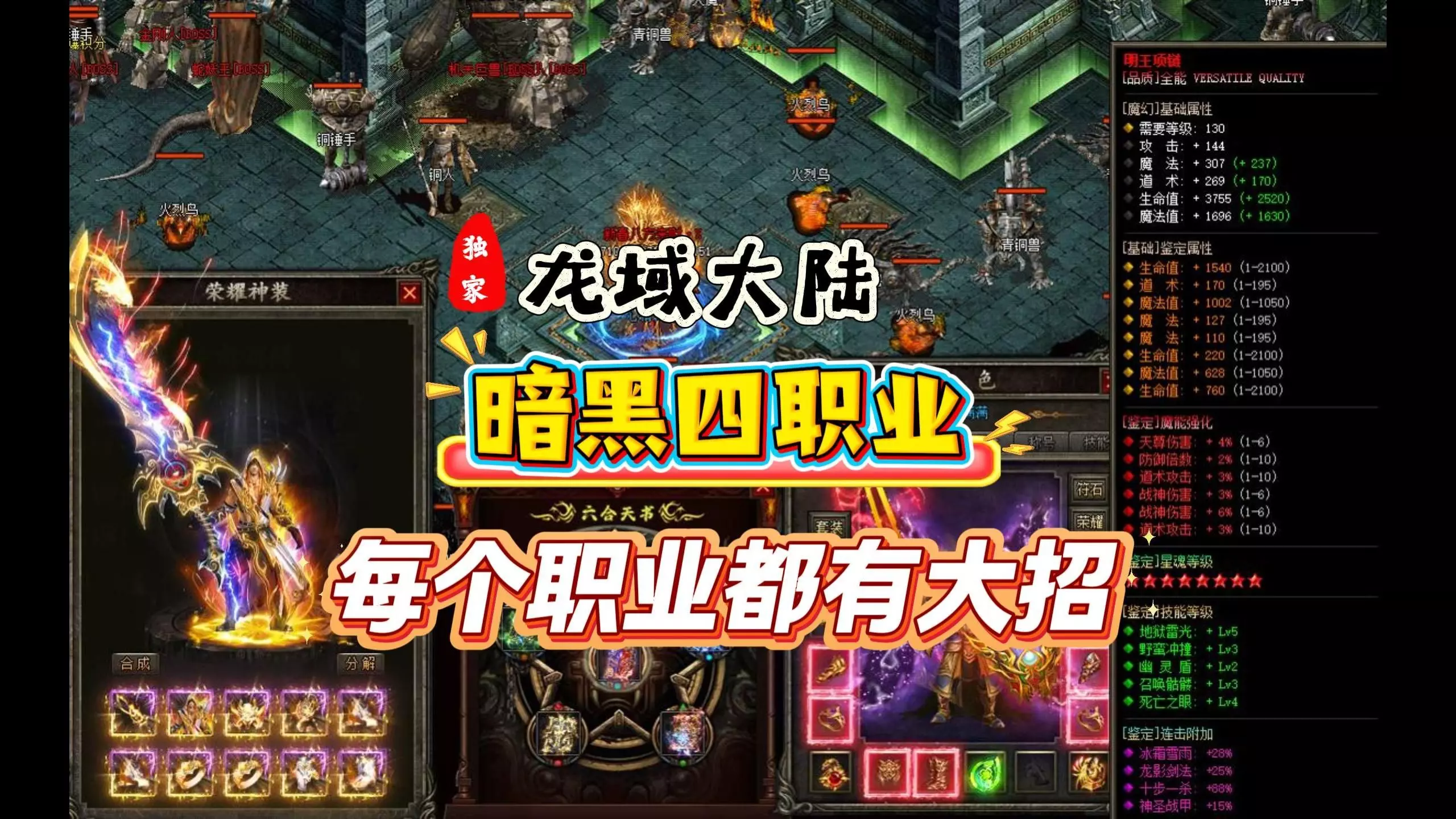 这是热血传奇三职业复古公益服,主打技能强化,装备靠打怪获取,支持自由交易。还展示了T4级武器霸世龙渊的属性,以及沧崖玩法相关的打怪、传承任务等内容,打怪体验畅快,非本职业装备可放交易行。