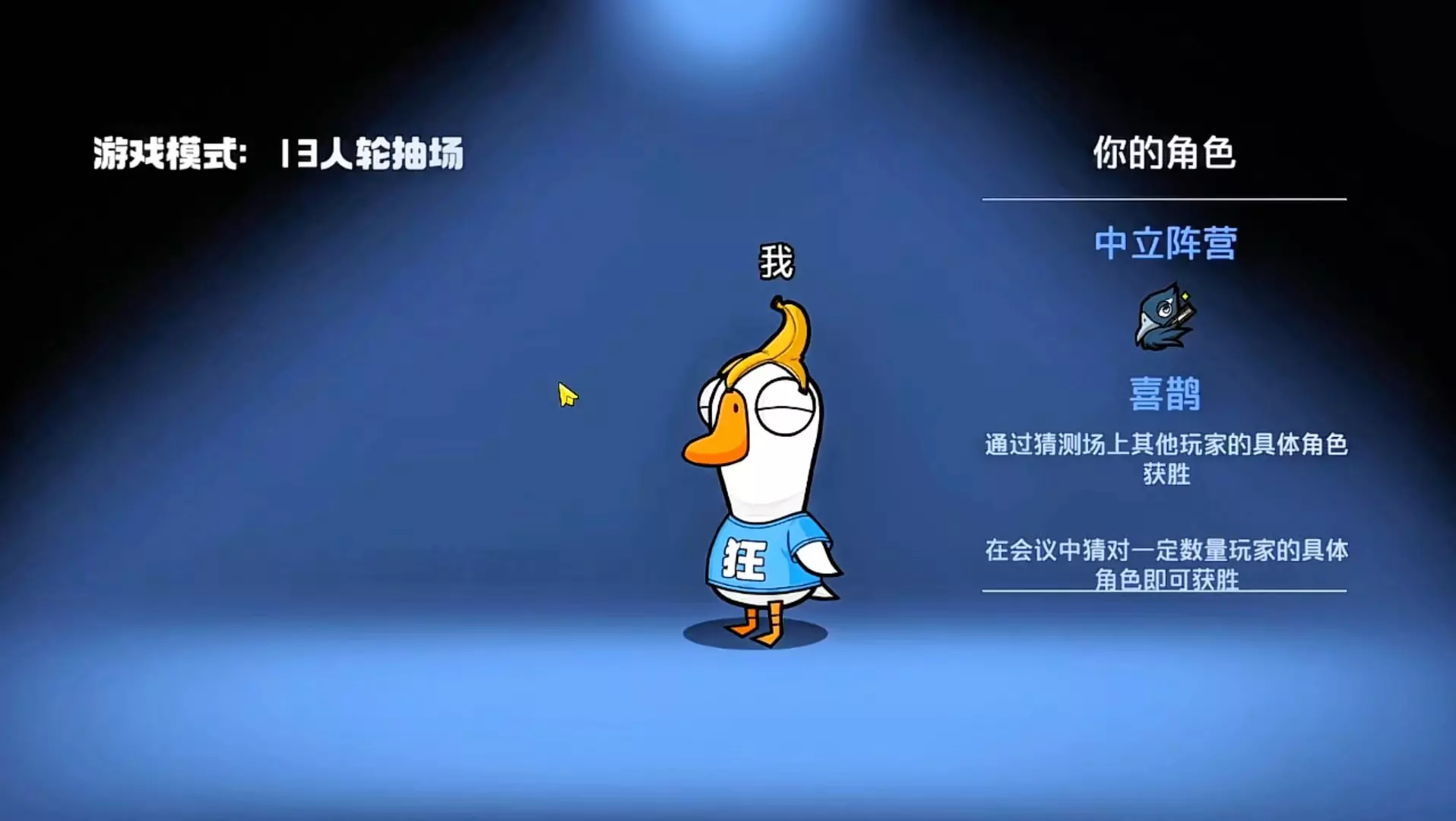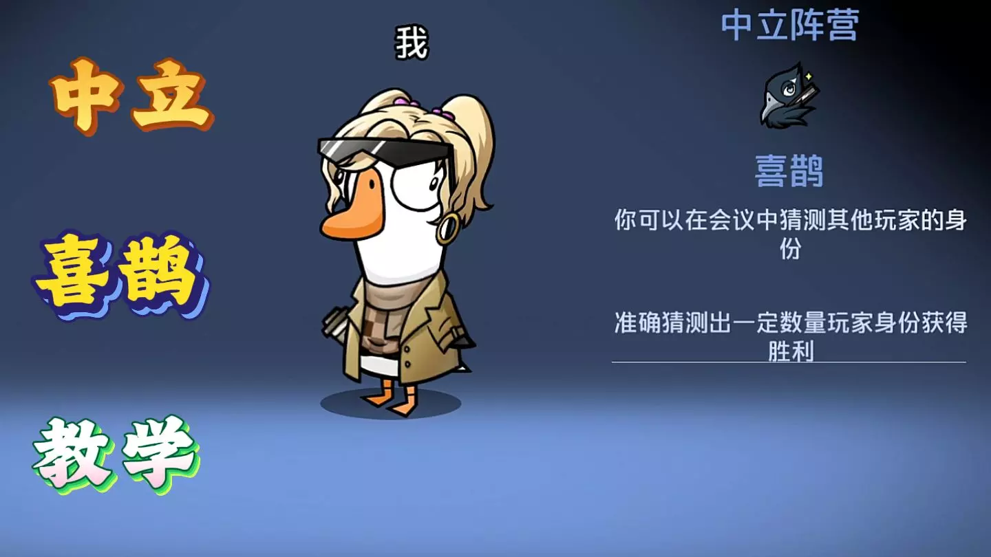 玩家分享策略游戏鹅鸭杀新角色喜鹊的初体验,喜鹊需通过猜测其他玩家角色获胜,本次因手速慢少猜了个警长没能赢,还称赞游戏UI制作精美。
