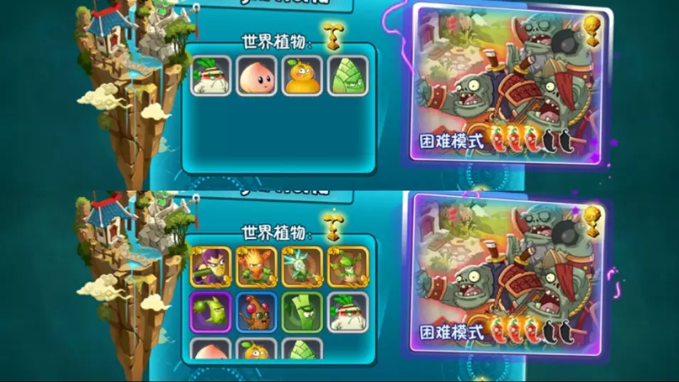 这是《植物大战僵尸2》的铃芽草高级植物任务内容,展示了在关卡中布置铃芽草等植物抵御僵尸进攻的过程,涉及摩登世界等多个游戏世界的相关任务挑战。