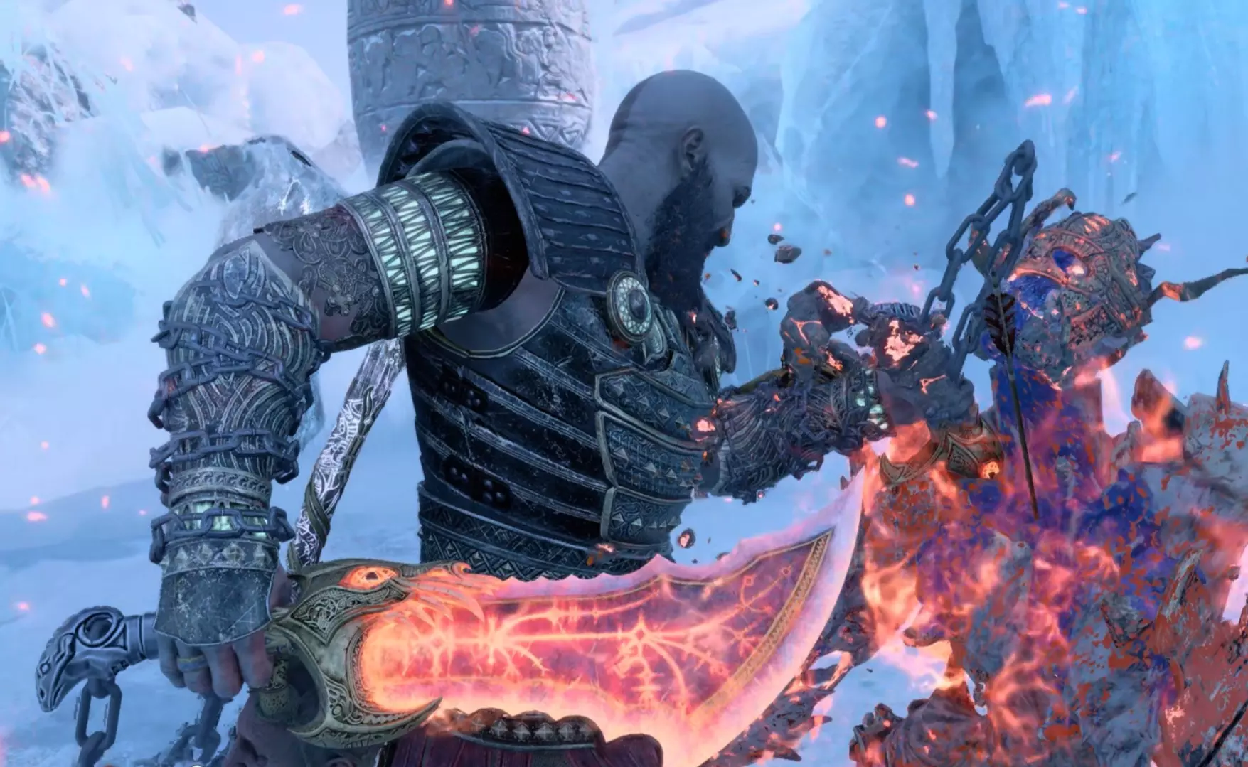 这是《战神5》的游戏内容分享,展示了奎托斯在充满奇幻风格的场景中行动,还呈现了使用武器解谜的画面,这正是发帖人玩《战神5》所喜爱的内容。
