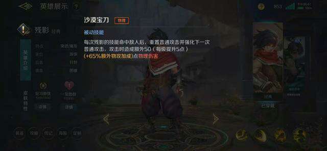 如果这样来看好像残影也算不上最强打野,但其实当你上手残影的时候你才会明白残影的强力。残影的输出主要是依靠一技能和被动,二技能和三技能主要是用来接近敌人,一技能"流沙之刃"会向指定方向释放一道剑气对路线上的敌人造成高额伤害。并且被该技能命中的目标会获得黄沙印记,当再次受到残影的伤害时会受到额外伤害,同时残影会恢复生命。