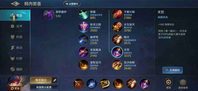 在这其中开天战斧、天罚和陨灭都属于可随时调换的装备。玩家要根据比赛局面来判断出什么装备,例如在前期的时候开天战斧能够有效的完成抓人,但是在中期对面射手优先出了吸血装备的时候就有必要更换成至高裁决。但是也不是说只要对方有变动就更换,主要是跟着法师和射手的装备进行变化,至于对面战士和坦克出了什么装备根本不用管,因为残影的目标不在他们身上。