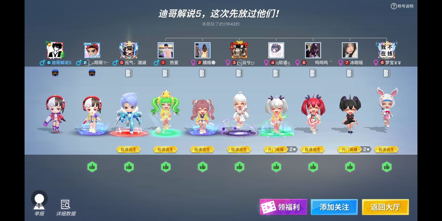 【9月16日更新修复部分游戏角色在对战斗中卡顿的问题,遇到该问题的玩家可选择更新到最新版本】 【9月7日全新道具卡“唤风镖”强势登场!】 *竞速之战道具卡更新,限时玩法【龙币争夺战】开启!* *魔术师·招财萌虎皮肤上架游戏商城* 8V2欢乐开黑竞技手游!求生!逃跑!躲猫猫!还能这么刺激?5分钟体验一场魔性搞笑的大乱斗,这把一定要逃出去呀! 【看!花里胡哨的道具】 菠萝捶人,大葱回血,滑板还能追跑车!各种脑洞大开的道具组合、奇葩刺激的对抗姿势等你来解锁。江湖上流传着一句话:“学物理,上逃跑,牛顿能被你气倒。” 【5分钟极速大乱斗】 5分钟能做什么?遇事不决玩逃跑!组队体验超刺激乱斗,真大神都能5分钟解决战斗、秀翻全场。少年快上车! 【各路人才在线恶搞】 大头萝莉、无情特工……有的角色看起来可可爱爱,打起人来谁都不爱。也有看起来一本正经,但总躲草丛阴你的大坏蛋!被打倒的猛男追捕,竟然靠“卖萌求饶”的表情包逃过一劫。