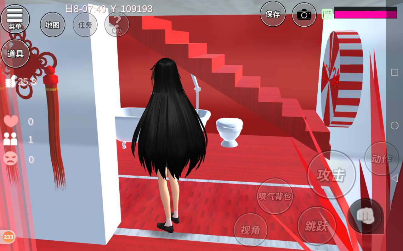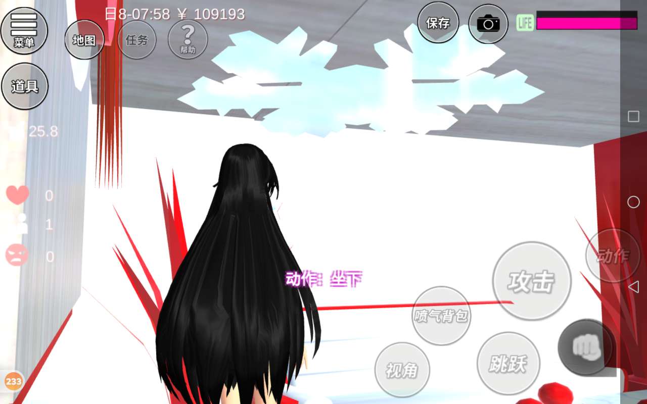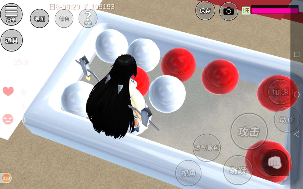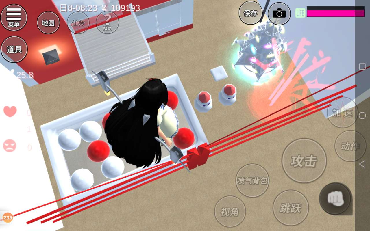 一进来就是一个泳池,泳池的海洋球是红白色的,非常喜庆,这边是一个小花园,小花园有两个雪人,还有一棵白色的圣诞树,一个人可以在这儿寂寞寂寞,还有两棵红色的树,颜色是红色的,非常喜庆