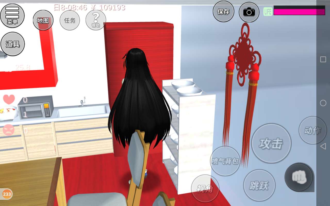 从这边过来是厨房,厨房的墙上我放了一个钟,九点钟的时候就可以来吃饭了,另外一边墙上还贴了倒和中国结,厨房里该有的都有,冰箱里有可口的美食,碗你很齐,这个冰箱颜色也很好看