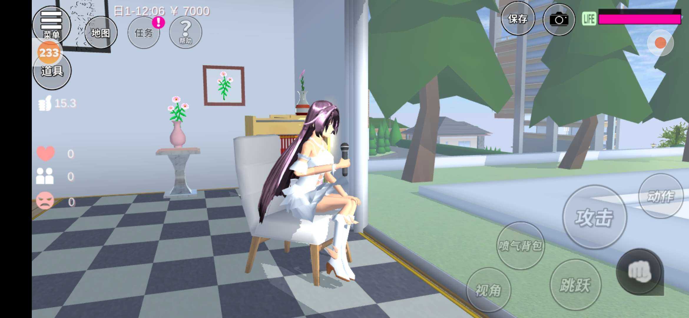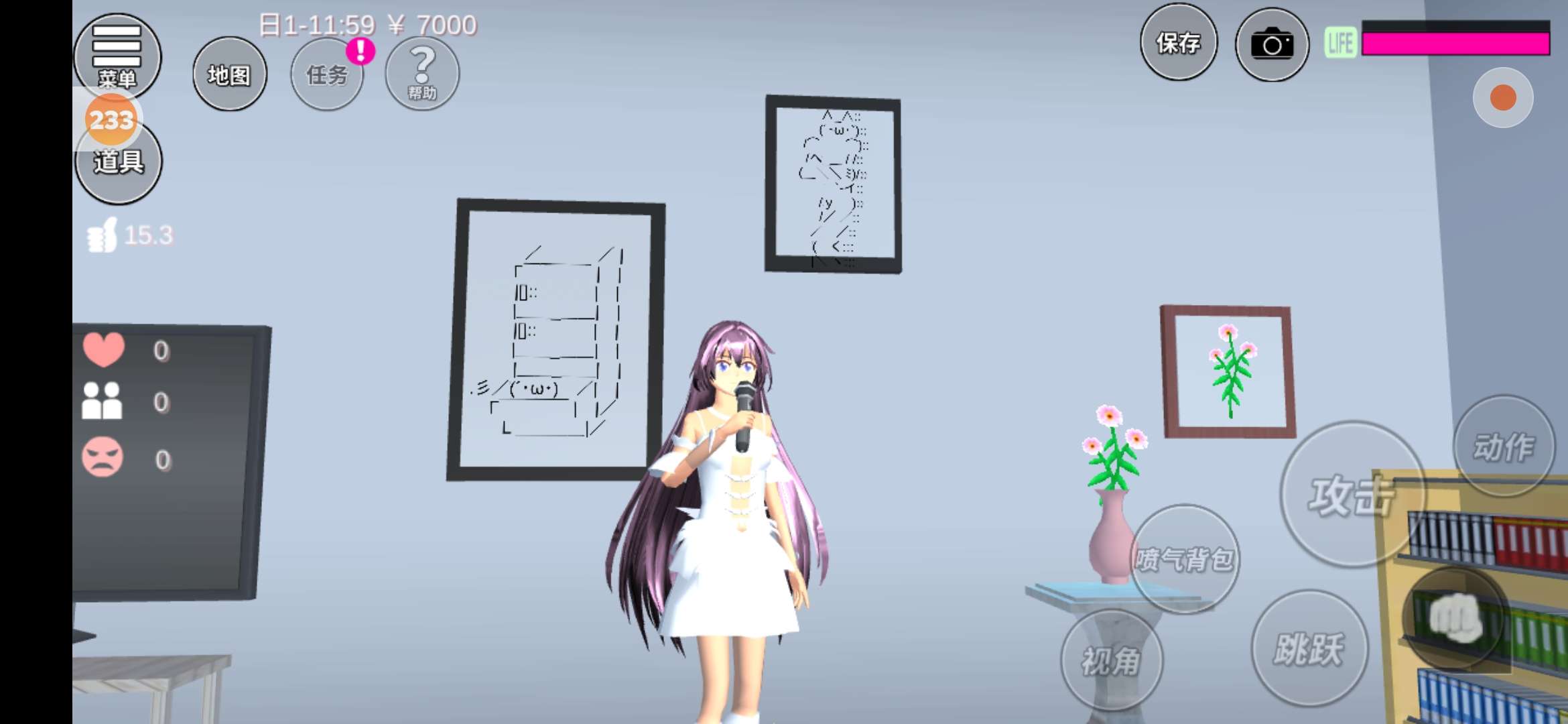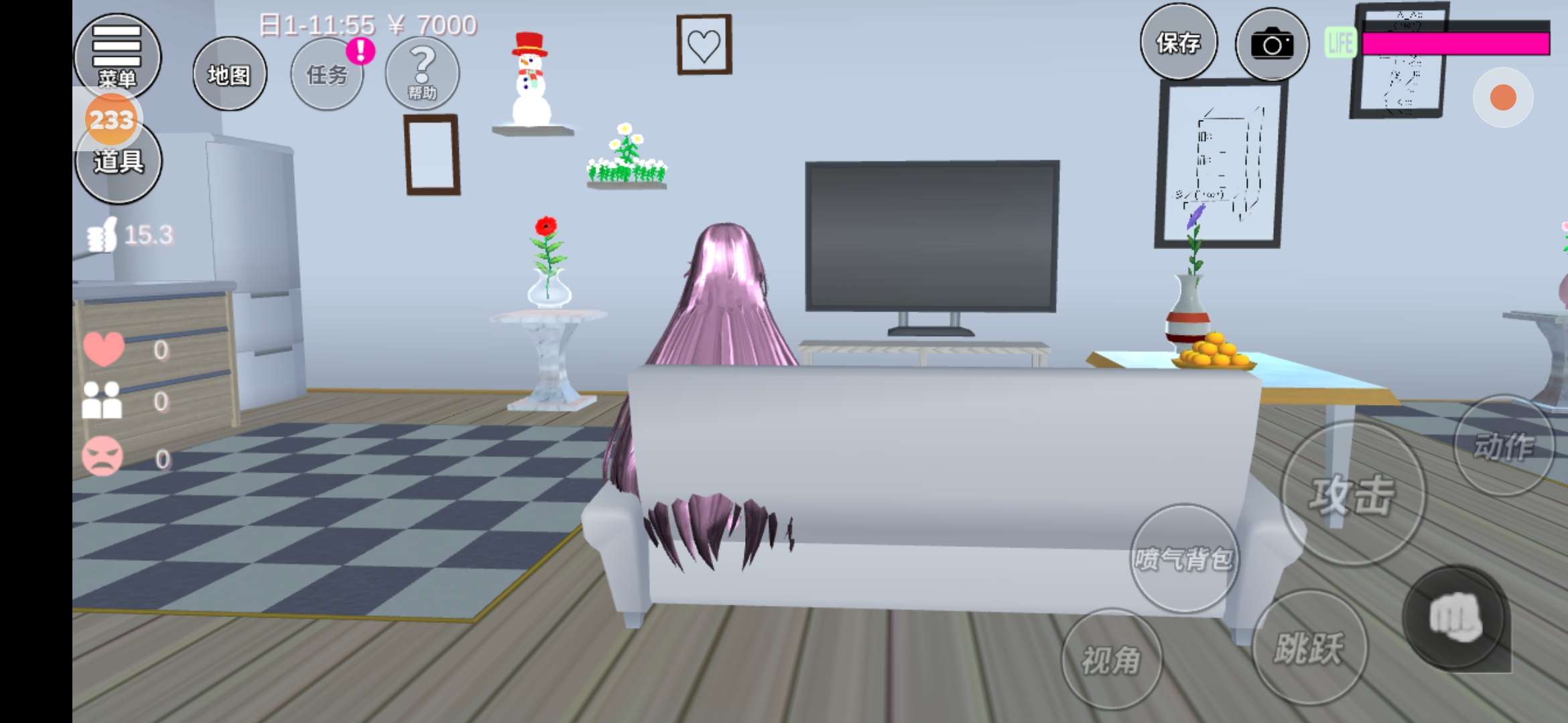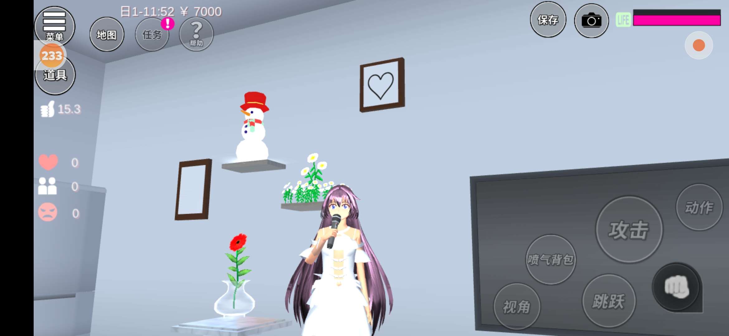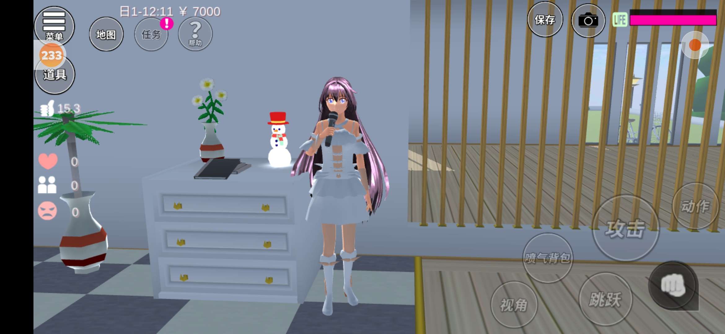 在我这边是个小柜子,柜子的旁边有棵树,柜子上面有瓶花,还有一个小雪人(这里有一些太啰嗦了,不想看的可以直接跳过)