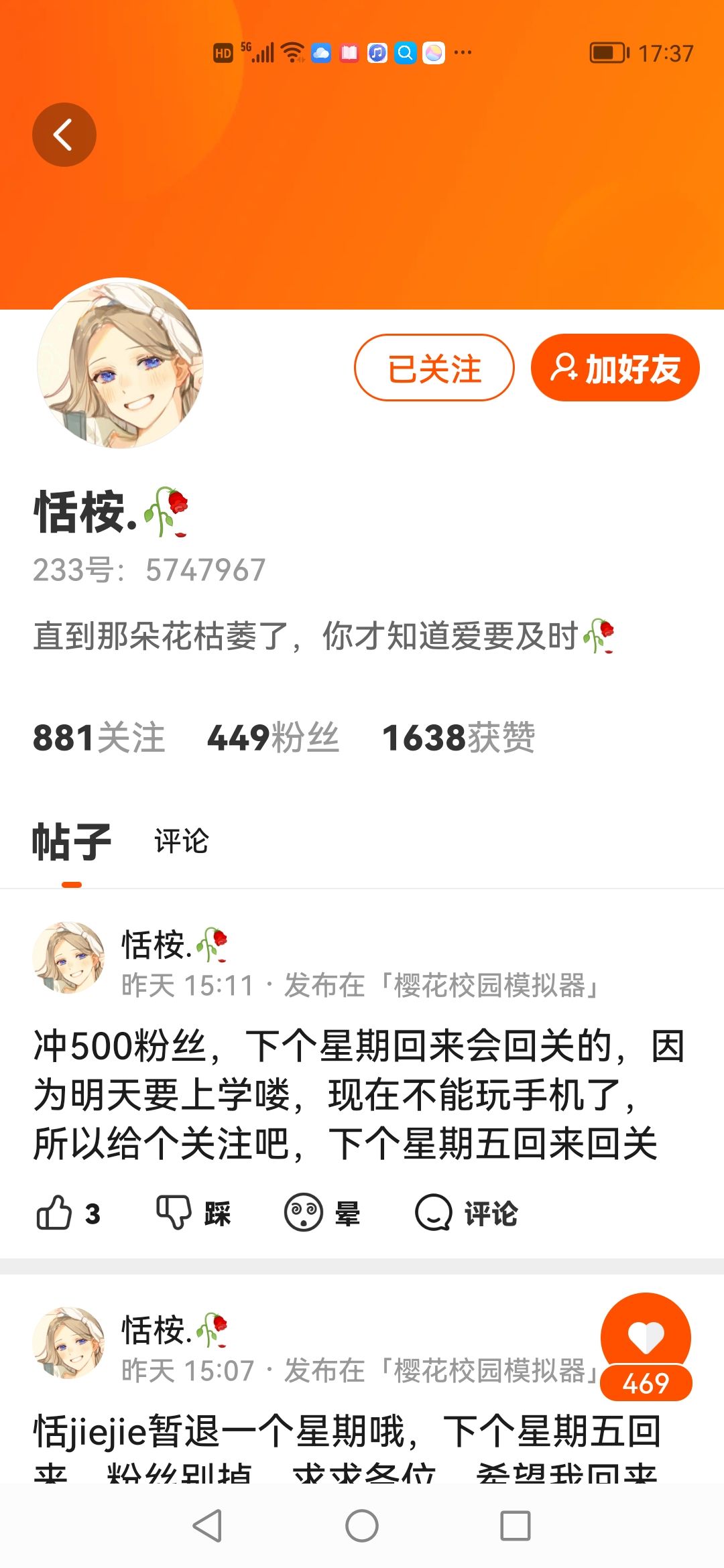 这个也是,我可以点个关注吗?这个星期五晚上会用这个号回关