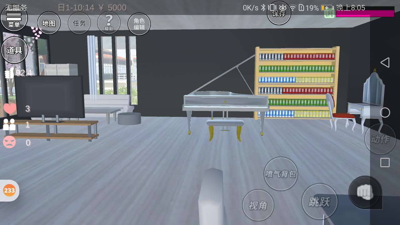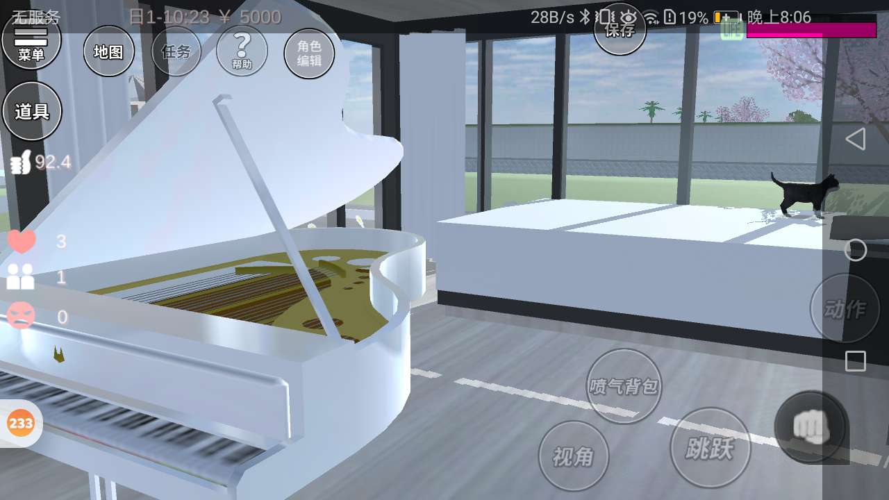 右边是钢琴和床。