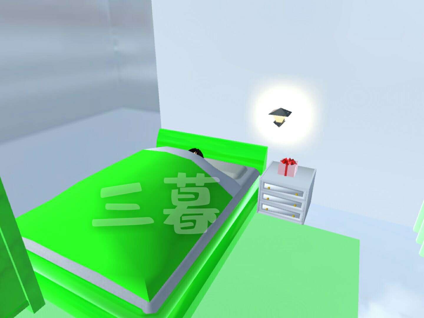 床头上的壁灯使在晚上有点安全感,床头柜上放着朋友送的小礼物