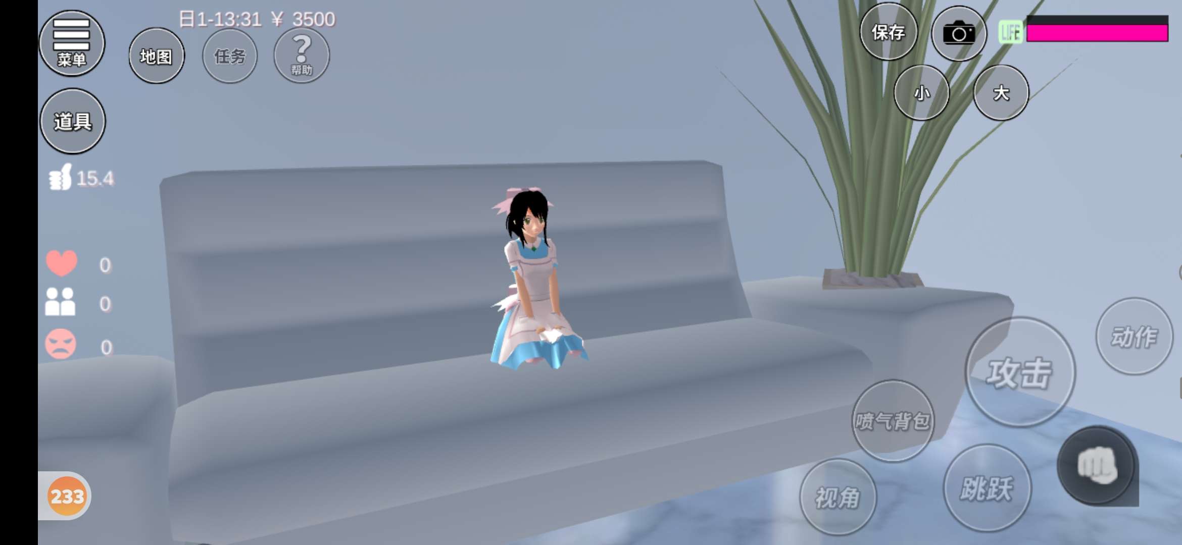 以白色系为主,颜色单调,但挺简单的呀,首先是一盆种在沙发里的植物,还有一个小沙发,对于变小的我来说,简直就是一张两米大床,我爱咋滚就咋滚,
