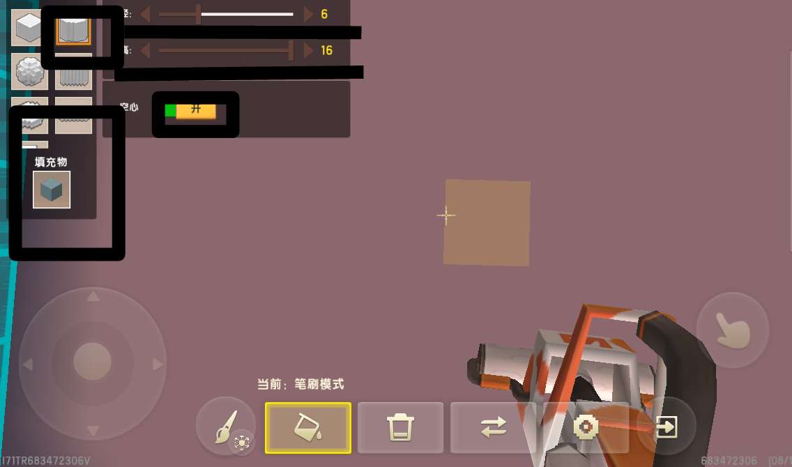 先用地形编辑器选择左上角第一行的第二个.之后在他的偏右侧选择半径为6,高为16.之后把空心打开.再点击填充物.