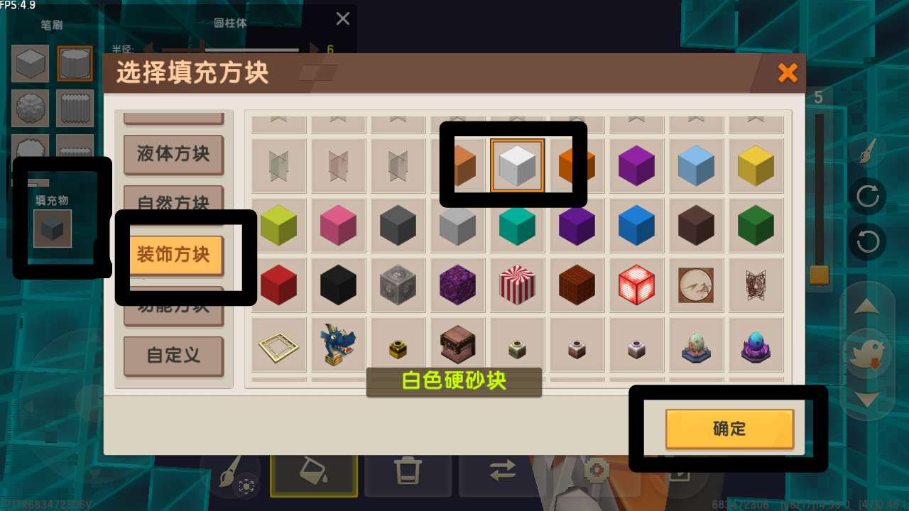 之后选择装饰方块再从里面找到白色硬沙块.