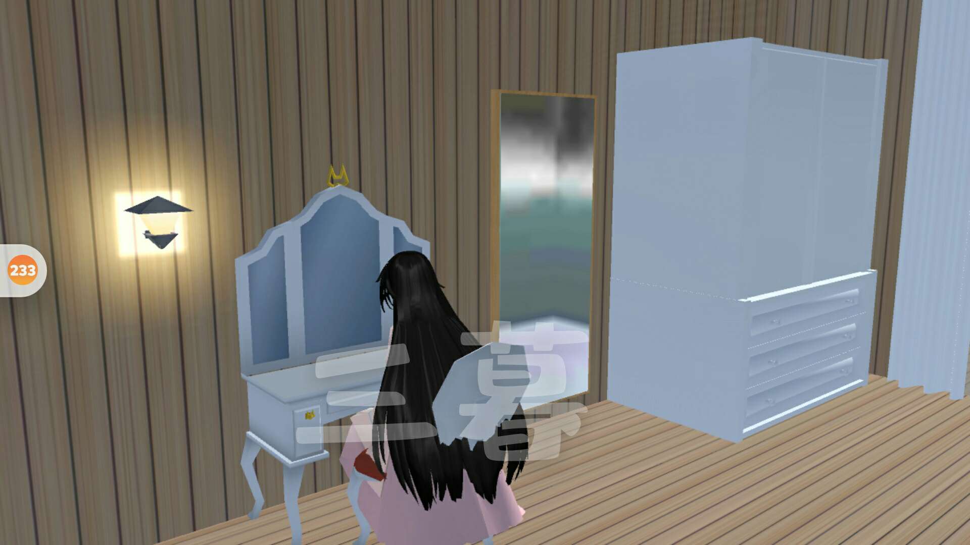 二楼左边就是梳妆台还有全身镜,看到那个白色的衣柜没有,和双子座就那大红房子,和里面的衣柜一样,下面是抽屉柜,上面是壁橱,我好喜欢啊