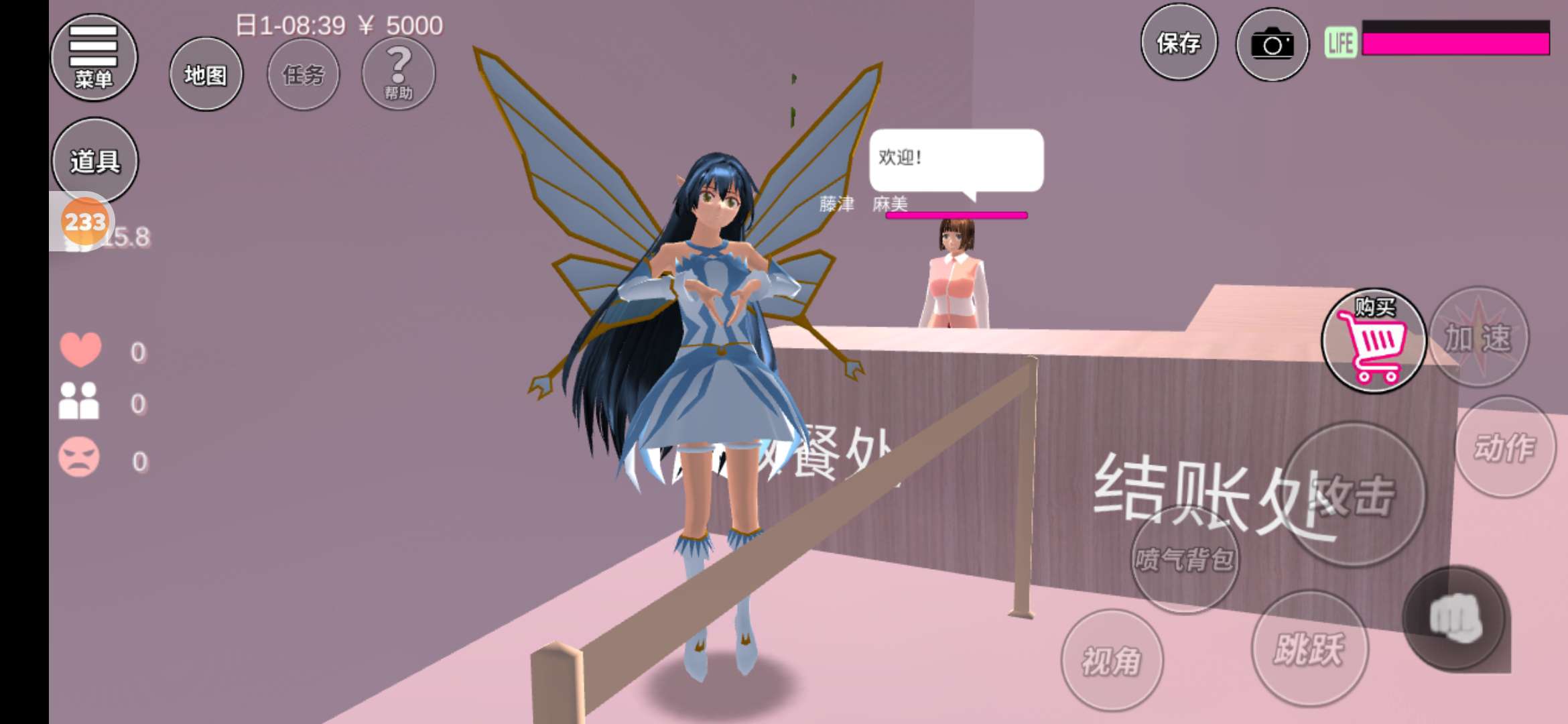 这里是收银台哦 ,因为刚开业,所以还没有顾客 ,看 !这里有收账处和取餐处 !还有服务员说欢迎光临哦