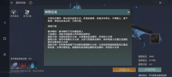 摆放好之后,有一个【入画】按钮,点击就能进入围狩图页面。在围狩图页面有四个等级不同的巨兽,分别是应龙,狌狌,萤皇和颙鸟。神兽强度随神兽开放等级提升,等级越高,奖励也越好。在页面左上角有关卡介绍,建议各位旅者进入前先看看技能介绍~
