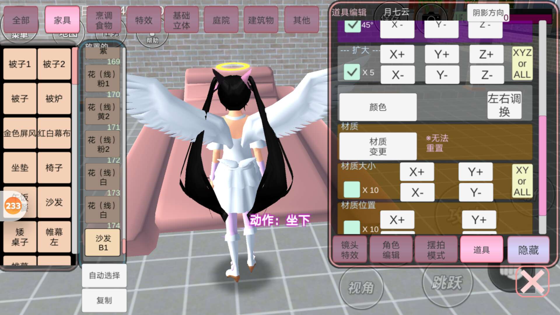 1,首先点物品编辑里的家具。找到沙发B1,点击扩大后面的黄色按钮,把他拉长。再把沙发拉宽一点。