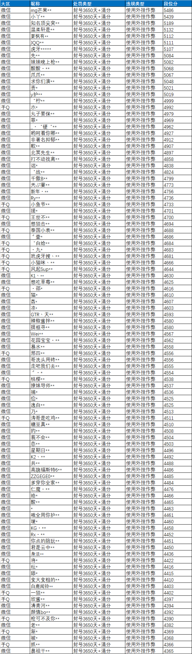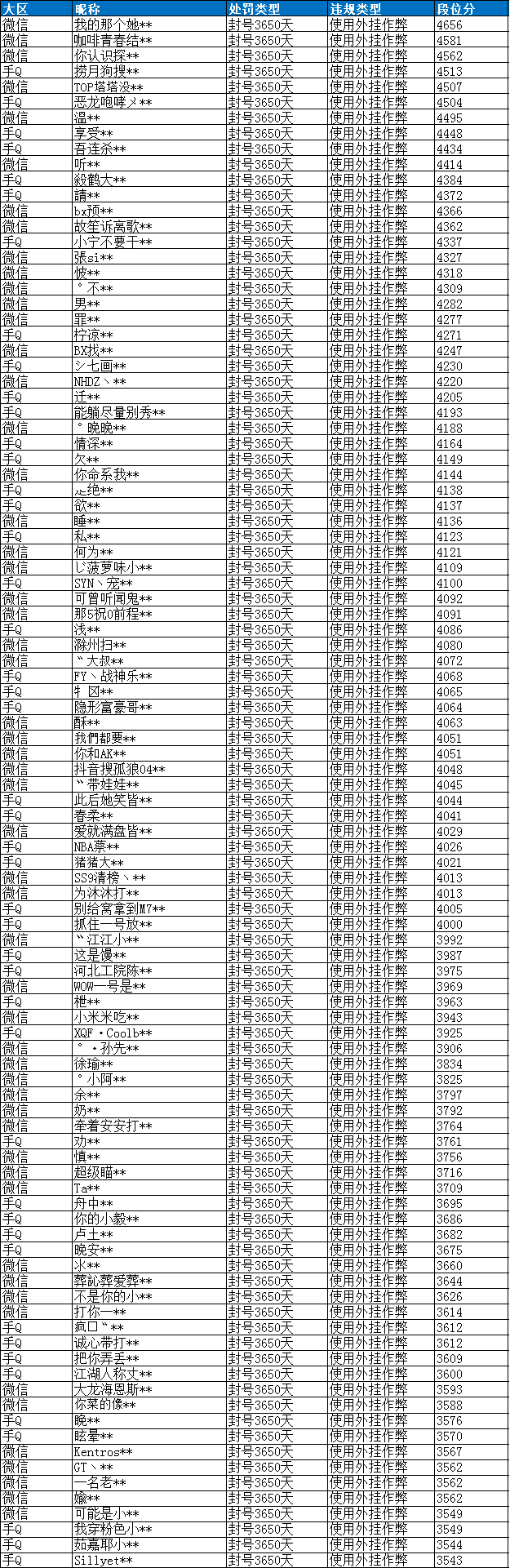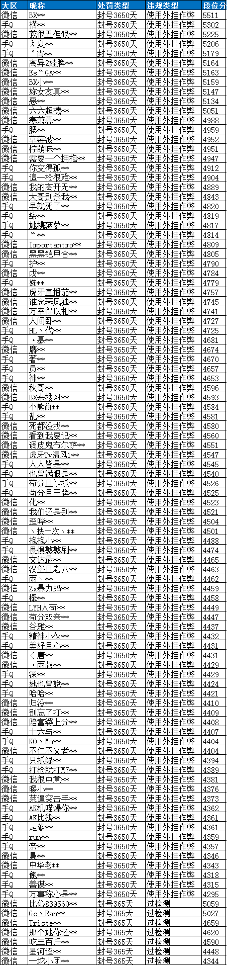 近期部分使用外挂违规特种兵名单: