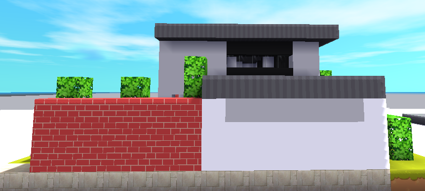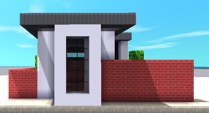 红色砖墙的出现一下就让我们的建筑生动了起来,这就是亮色点缀的作用,然后是背面的围墙。
