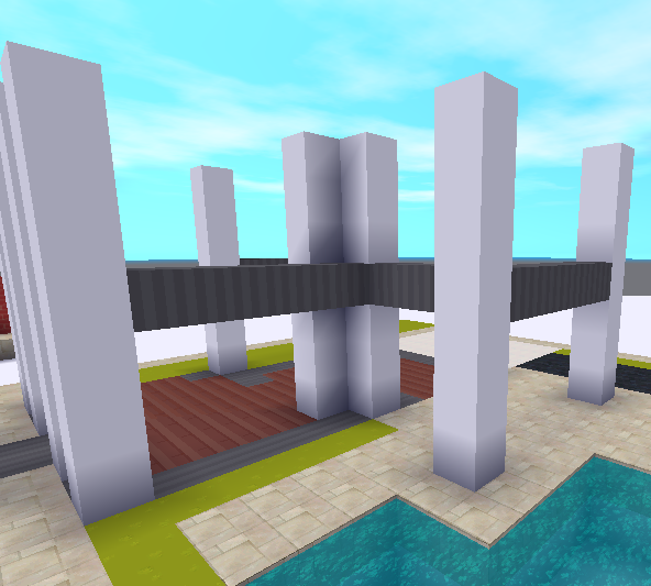 竖梁搭建好后我们搭建横梁,用灰色羊毛块,在离地面第4格的位置搭建,将我们7格高的柱子分割为了各3格的两层楼。