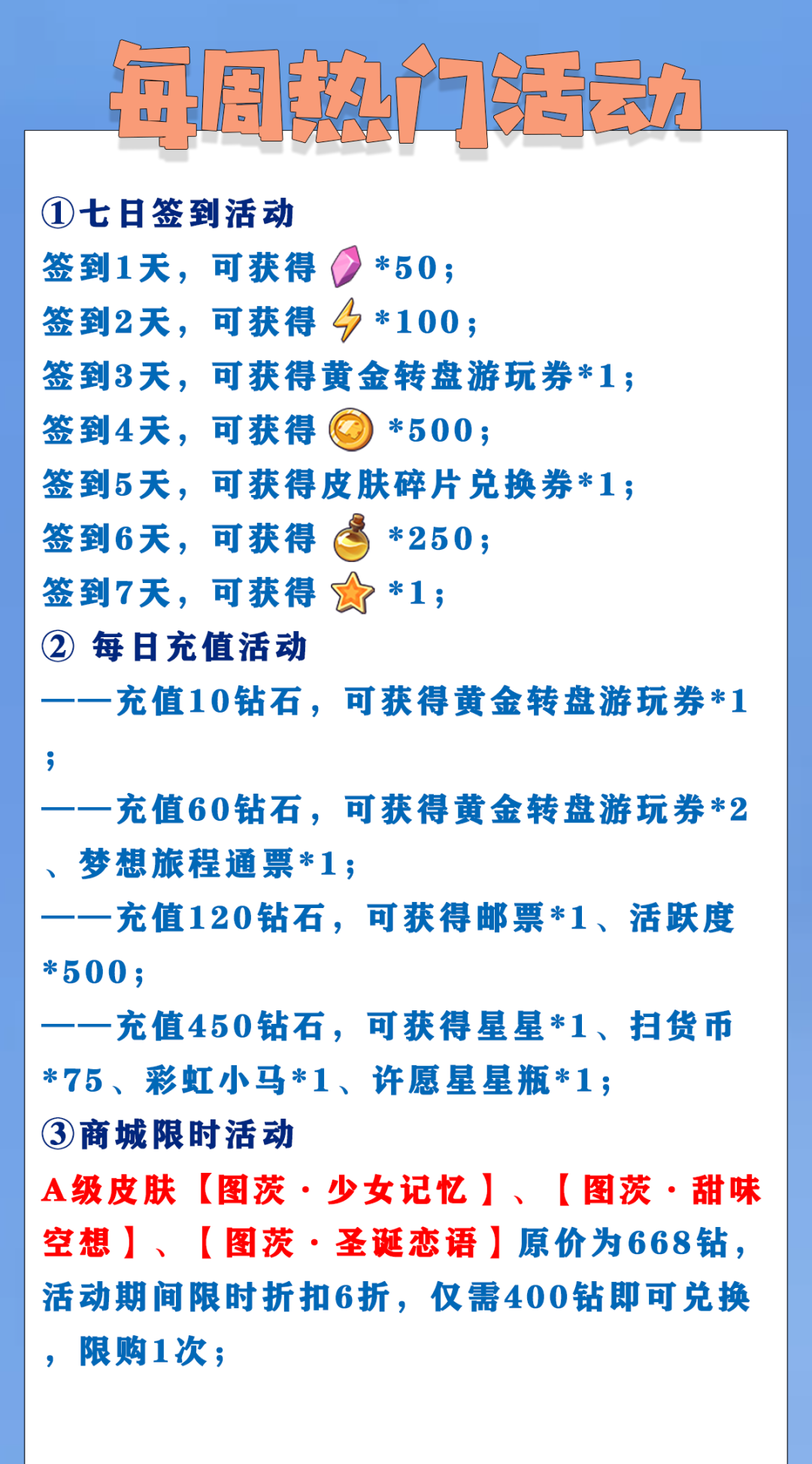 ——充值120钻石,可获得邮票*1、活跃度*500;