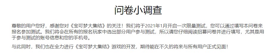 以方块造型的宝可梦为主角的休闲收集对战手游《宝可梦大集结》将于2021年1月开启一次限量测试,您可以通过填写本问卷来报名参加测试。我们将会在所有的报名玩家中选出部分用户参与测试,所以请您仔细阅读招募问卷并进行填写,尤其是用于参与测试的账号信息和您的手机号。
