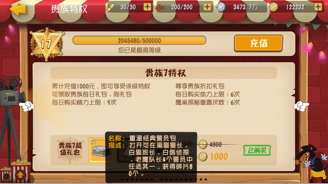 点评:V7没有新开放的特权,但是在一折礼包中,却有着令人垂涎三尺的重温经典警员包,可以在黑猫警长、白猫班长、白鸽侦探、老鹰队长4个金色警员中任选其一!每一位都是响当当的人物,名至实归。如果有付费动力,那么充到V7开局一定不亏,但像小编就只能在解解眼馋的同时,去金色警员活动中拼扶老奶奶过马路了……