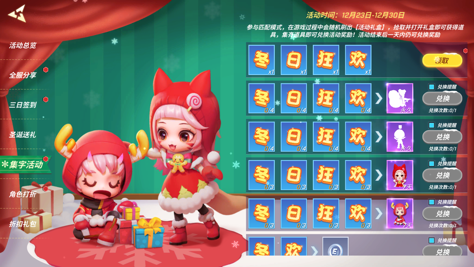 积累一定数量的【圣诞花环】可以兑换永久涂鸦、角色碎片等好礼哦!
