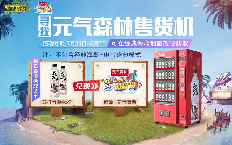 活动期间在经典海岛的元气森林售货机获得苏打气泡水,每日最多拾取2个,可在活动中心兑换喷涂-元气满满奖励。