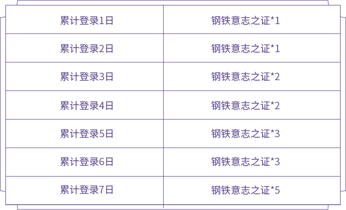 ①累计登录:通过累计登录活动,累计登录7日总共可获得钢铁意志之证*17