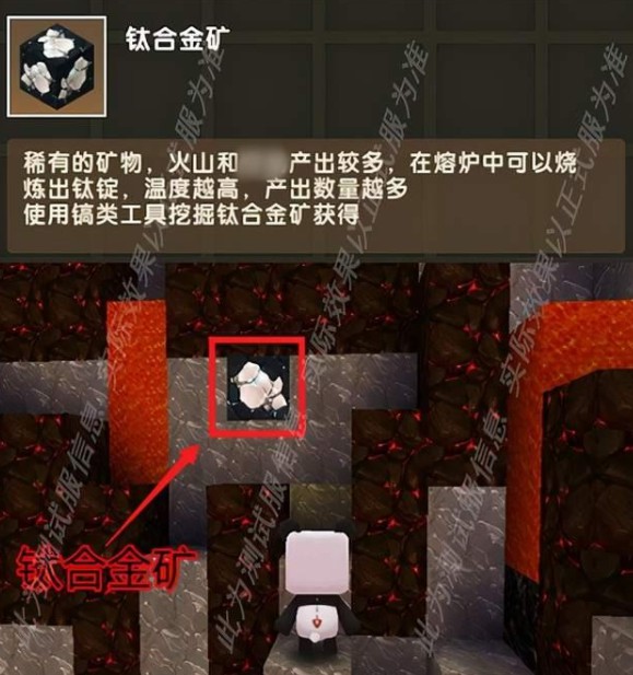 在火山中我们可以找到钛合金矿,找到了钛合金矿后就可以合成目前游戏里最强的道具——钛合金系列的装备啦!