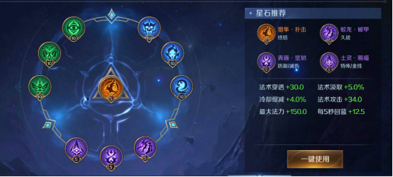 蓝绿星石主要是法术穿透、法术汲取和冷却缩减为主。紫色星石推荐蛟龙,青藤,土灵,提升持续作战能力续航,橙色星石选择猎隼,加强其爆发输出能力。