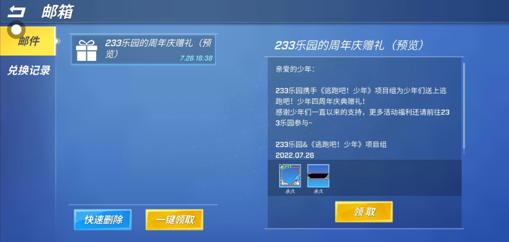 活动期间233乐园的用户登录《逃跑吧!少年》游戏,在主界面点击右上角图标,选择【邮件】进入邮箱,找到对应的邮件领取奖励。