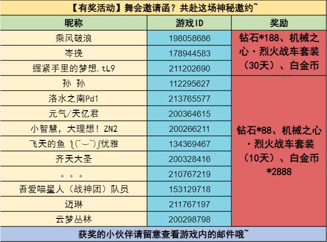 舞会创意达人(3名):钻石*188、机械之心·烈火战车套装(30天)、白金币*2888