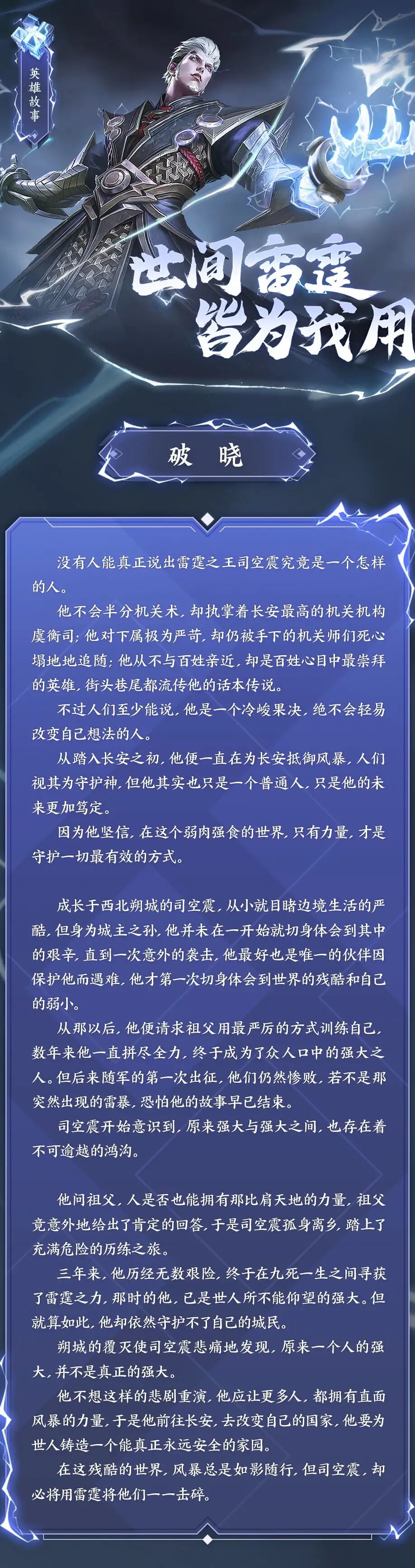 司空震是一位冷峻强横的雷霆之王,他身穿雷云铠甲,掌五雷震鼓,控雷霆之力。拥有着雷电般的作战方式,以绝对的力量守护长安,守护一切。