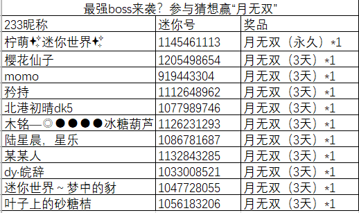 迷你世界活动奖励发放公示