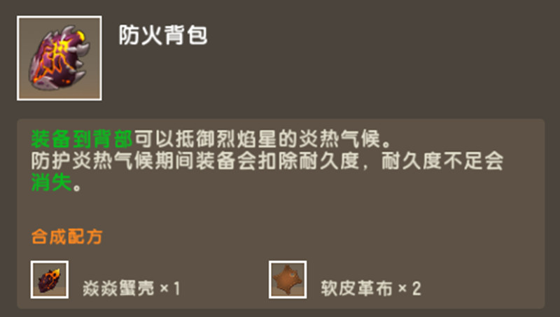胖叔也告诉过冒险家们,通过星站前往烈焰星击败远古黑龙便可获得烈焰断剑!而冒险家们在火山地形里可以击杀焱焱蟹获得焱焱蟹壳,然后去制作防火背包,装备防火背包可以抵御烈焰星的炎热气候。