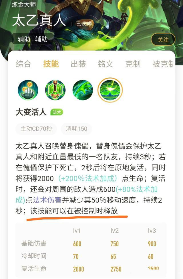 经过测试,并没有吸引远程兵的仇恨,只是站在远程兵所发射攻击的弹道前,就会受到伤害,所以在清理兵线的时候,侧着站位是很有必要的。 三.太乙真人大招的局限性 太乙真人的大招能够复活自己和另外一名队友,在团战中相当于7V5了,关键时刻保住C位可以扭转战局,就是这么一个强大技能,还可以在控制中开启。