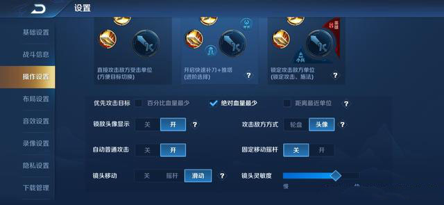 五.绝对血量值设置机制 这条可能大家不是很明白,是关于一条操作设置的。当设置优先攻击目标为“绝对血量最少”时,在团战中就可以率先击杀血量最低的那个英雄,而不会因为百分比血量而攻击成坦克。